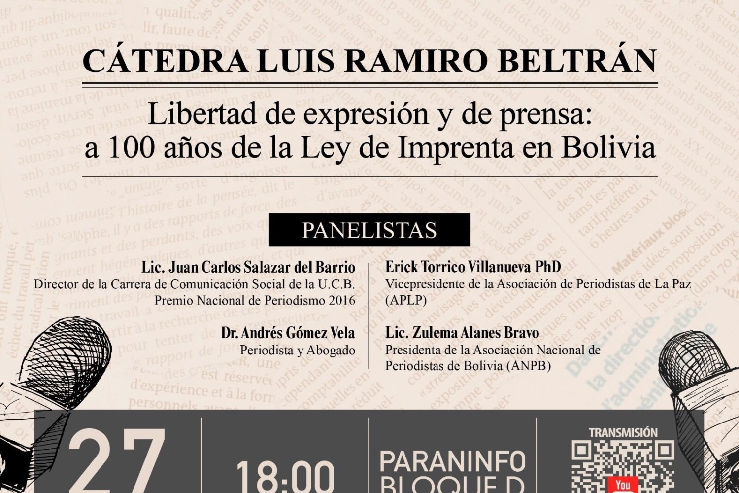 El panel titulado “Libertad de expresión y de prensa: a los cien años de la Ley de Imprenta” estuvo conformado por Juan Carlos Salazar, Director de la Carrera de Comunicación de la Universidad Católica Boliviana “San Pablo”; Zulema Alanes, Presidenta de la Asociación Nacional de Periodistas de Bolivia; Erick Torrico, Vicepresidente de la Asociación de Periodistas de La Paz, y; Andrés Gómez, abogado, periodista y docente universitario. Cada uno de los expositores abordó desde distintos ángulos aspectos que hacen a la historia, naturaleza, vigencia y continuidad del principal instrumento normativo que garantiza la libertad de expresión y de prensa en Bolivia.
