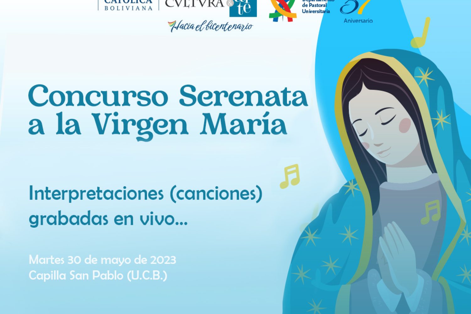 Con el objetivo de fomentar la devoción mariana y promover el talento y la creatividad musical, el Departamento de Cultura y Arte de la Universidad Católica Boliviana “San Pablo” (U.C.B.), en colaboración con la Pastoral Universitaria, convoca al IX Concurso de Composiciones dedicadas a la Virgen María.