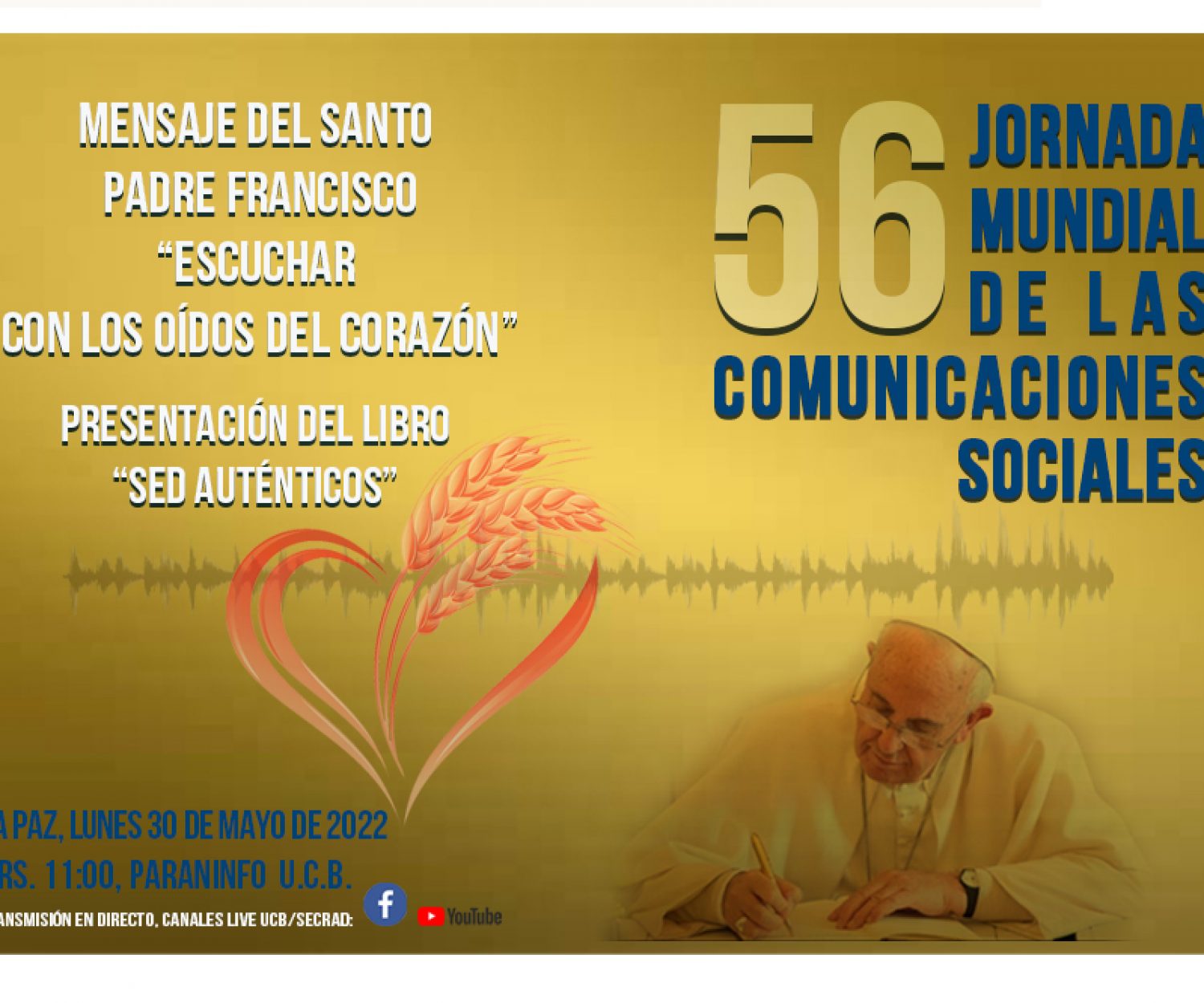 noticias 31 May 2022 56 JORNADA MUNDIAL DE LAS COMUNICACIONES SOCIALES ESCUCHAR CON LOS OÍDOS DEL CORAZÓN Como cada año, desde 2015, oportunidad en que Bolivia recibió la visita pastoral del… Marcelo Bustillos