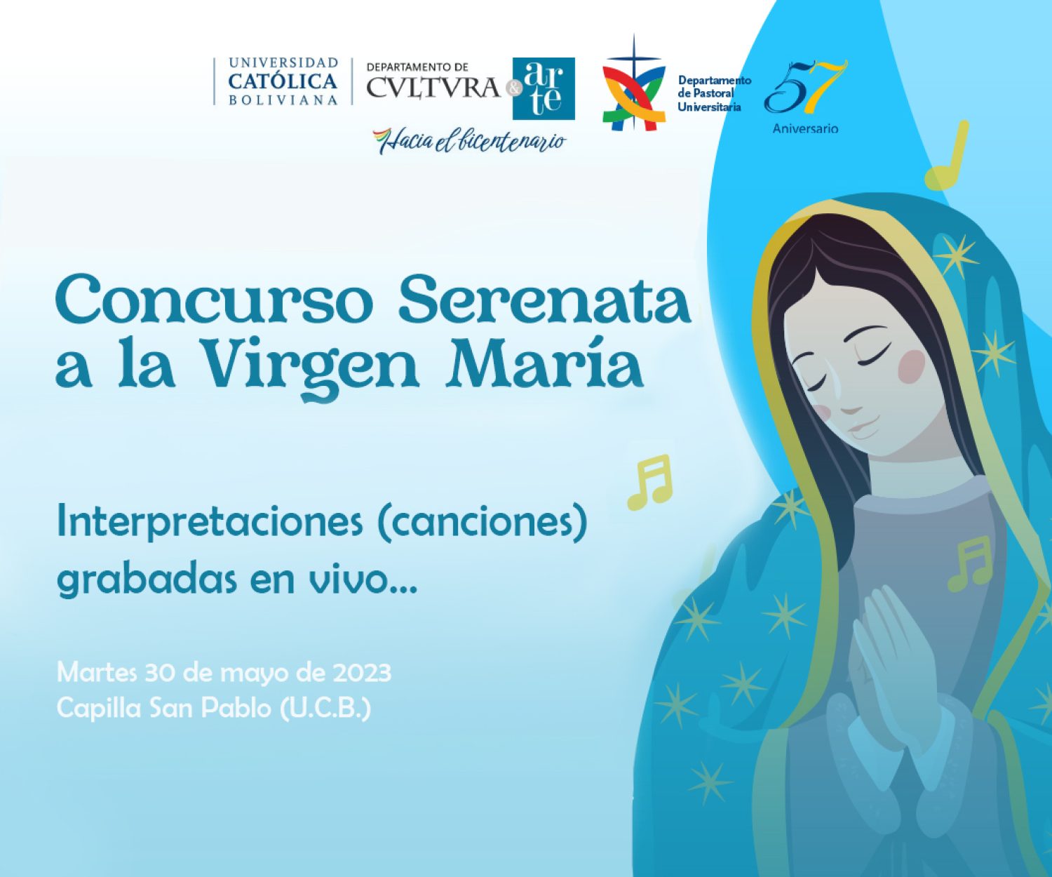 noticias 06 Jun 2023 CONCURSO SERENATA A LA VIRGEN MARIA Con el objetivo de fomentar la devoción mariana y promover el talento y la creatividad musical, el Departamento de Cultura… Marcelo Bustillos
