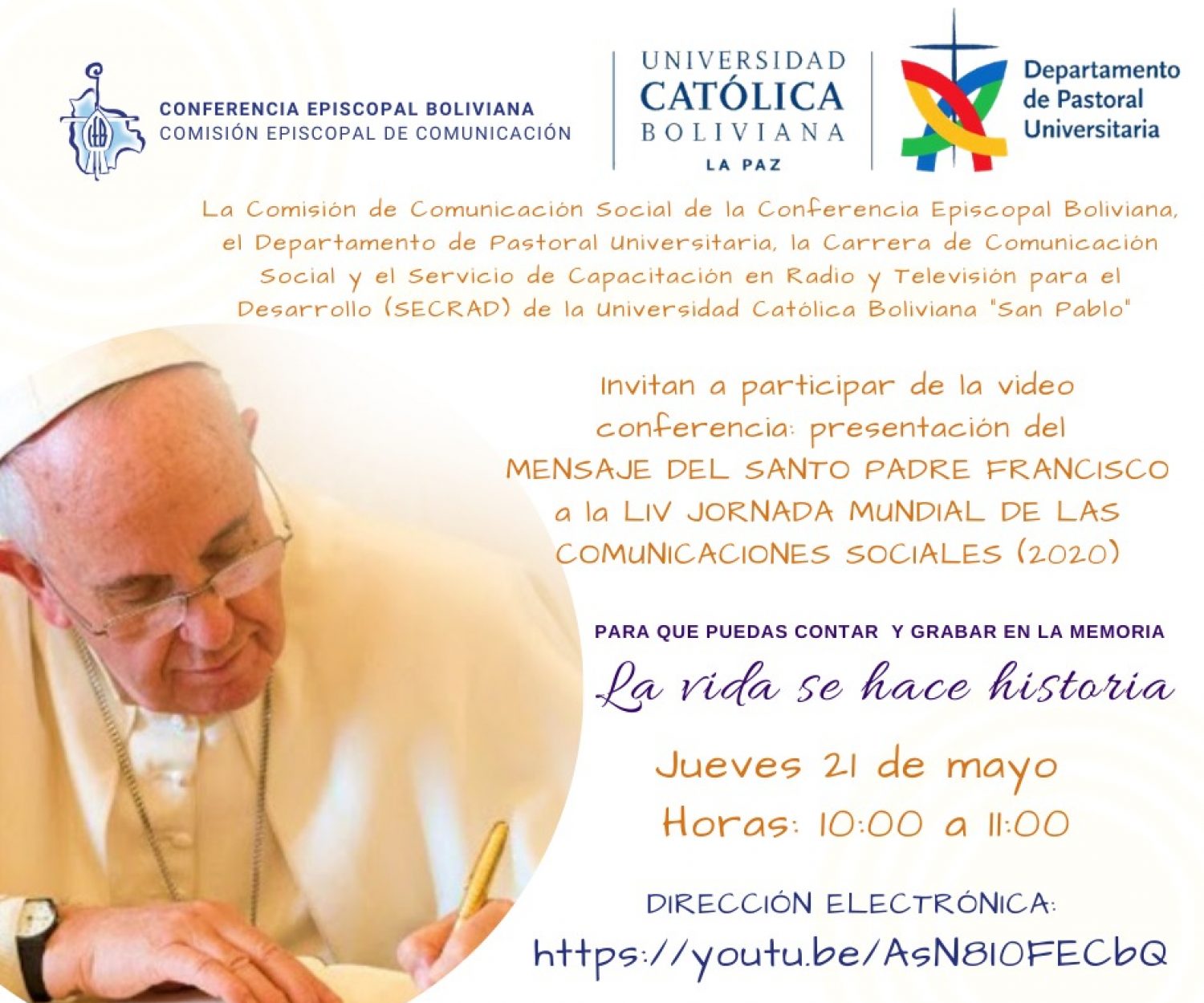 noticias 21 May 2020 VIDEO CONFERENCIA “LA VIDA SE HACE HISTORIA” MENSAJE DEL SANTO PADRE FRANCISCO 54 JORNADA MUNDIAL DE LAS COMUNICACIONES SOCIALES Hoy 21 de mayo de 2020 se celebra… Marcelo Bustillos